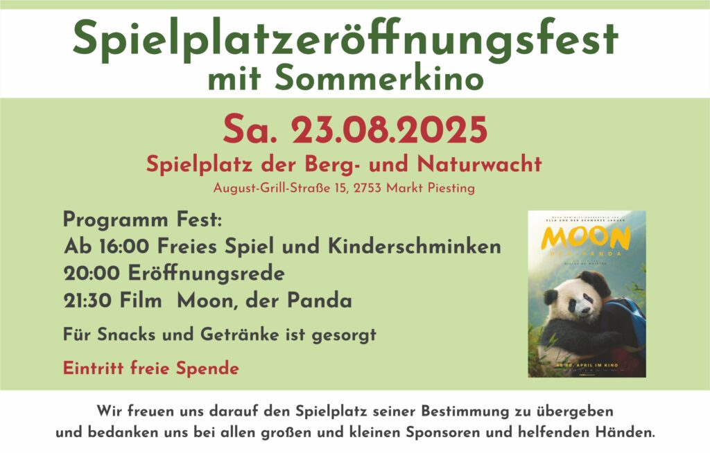 Nach knapp 5 Jahren Projektlaufzeit, dürfen wir mit Freude die Fertigstellung des neuen Spielplatzes der Berg- und Naturwacht Markt Piesting und Dreistetten verkünden. Dank der großzügigen Sponsoren und Spender und den unzähligen Arbeitsstunden unserer Mitglieder, sowie vieler freiwilliger Helferinnen und Helfer, konnte dieses Projekt gestemmt werden. Der Spielplatz wird nun an die Kinder übergeben und wir hoffen, dass sie hier schöne und unbeschwerte Stunden verbringen werden. Um den Spielplatz so rasch wie möglich seiner Nutzung zuführen zu können, wurden Teile der Spielgeräte zwischenfinanziert. Für diesen letzten Schritt benötigen wir noch einmal eure Unterstützung. Wir freuen uns über jede Spende bzw. über jedes Sponsoring.